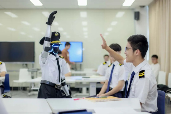 “Good morning, future captains!”一走进教室,英语问候声就传来,一身机长制服的人形机器人助教“小C”马上吸引了大家的目光。