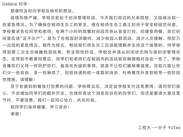 新民晚报讯(记者郜阳)“至于你提到的餐食打包费的问题,学校商议后,决定由学校支付这笔费用,请同学们放心,不会增加同学们的额外开支。”3月15日,封闭管理中的一位上海工程技术大学学生Debbie给该校校长俞涛写信,提出自己对校园封闭管理的建议和意见,俞校长第一时间回信,并署名“工程大·一分子 YuTao”。