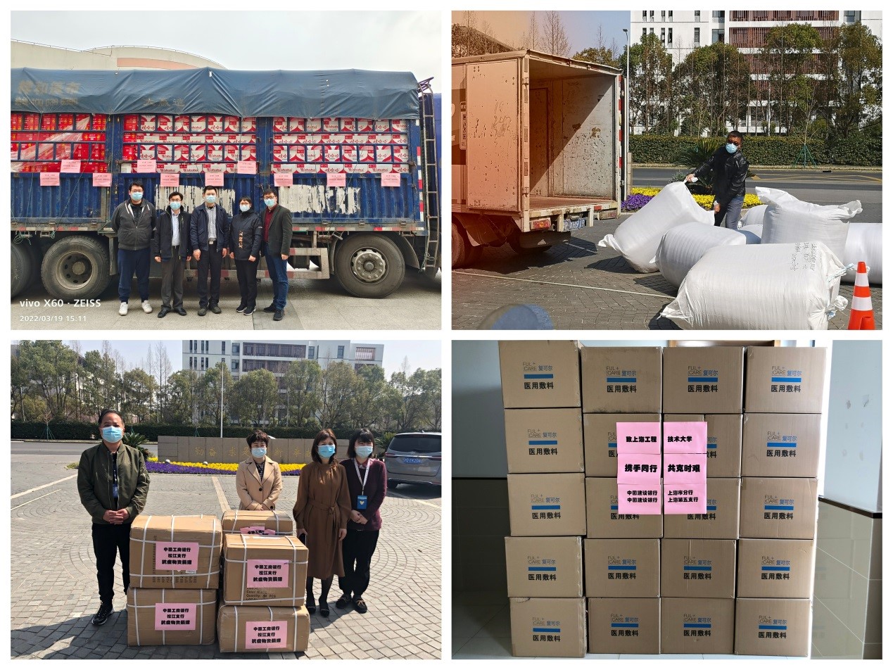 3月14日,建设银行第五支行捐赠2000套防护服;3月15日,招商银行上海分行捐赠100套被子枕头被褥,工商银行松江支行捐赠600套防护服和600个隔离面罩;3月16日,招商银行松江支行捐赠100条被子,中国银行长宁支行捐赠2000份护目镜、2000份N95口罩、2000份手套;3月19日校友钱政东捐助1000箱水和2000箱八宝粥,以上捐赠均已陆续抵达学校。同时在途的还有招商银行松江支行捐赠的折叠床等。