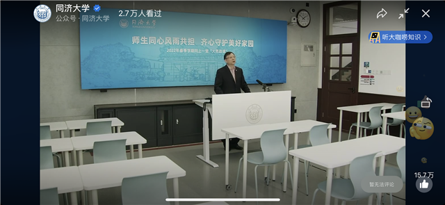 “致敬每一个平凡的抗疫人”的抗疫视频成为这堂思政大课的结语,也汇成这一特殊时期令人难忘的同济记忆。据悉,共7万余人次通过同济大学视频号在线聆听了这堂大思政课,获得26万余人次点赞。