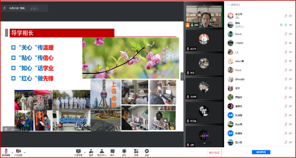 副院长郭辉解读了学校疫情防控管理的最新政策,对做好学院校内外研究生的管理和思想工作做进行部署,并对防疫期间如何有效推进研究生毕业论文指导、研究生复试以及研究生学位论文答辩等工作提出了明确要求。他强调,全体导师应“以关心传递温暖、以贴心给予信心、以知心关心学业、以红心争做先锋”,通过线上渠道与学生保持密切互动交流,把握好学业指导,保证学生有健康的心理和生理。