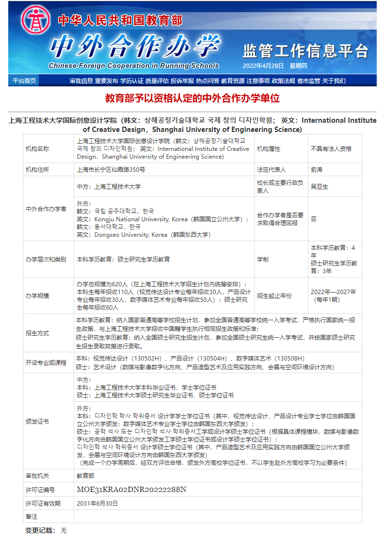 近日,我校与韩国国立公州大学、韩国东西大学联合成立的非独立法人中外合作办学机构获教育部批准。该机构是我校获批的首个中外合作办学机构,也是国内首个设计类中韩合作办学机构。机构名称为:上海工程技术大学国际创意设计学院(韩文译文:상해공정기술대학교국제창의디자인학원;英文译文:International Institute of Creative Design,Shanghai University of Engineering Science)。