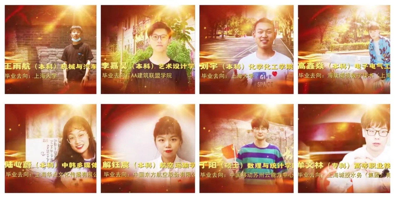 机械与汽车工程学院王雨航、电子电气工程学院高鑫焱、化学化工学院刘宇、艺术设计学院李嘉昊、航空运输学院、飞行学院解钰宸、中韩多媒体设计学院陆心蔚、高等职业技术学院牟文林、数理与统计学院丁阳等八位上海市优秀毕业生代表分享了自己在校期间的成长经历与收获,表达了对母校的感恩之情。