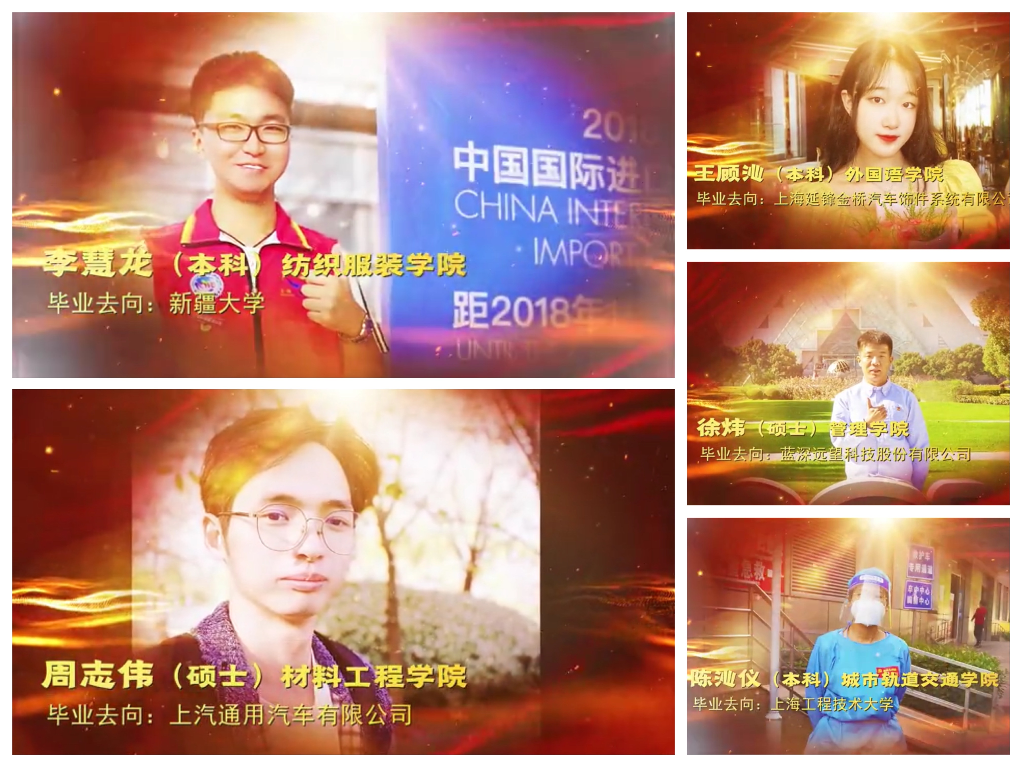 会上,管理学院毕业生徐炜分享了自己响应国家号召主动参军入伍、积极参加西部计划,到祖国最需要的地方经受考验、发光发热的感人事迹。材料工程学院毕业生周志伟分享了自己从一名普通学子成长为科研达人,成功入职世界500强企业——上汽通用汽车有限公司的成长经历。纺织服装学院毕业生李慧龙分享了自己受学校援疆教师的感召,报考新疆大学研究生,立志服务边疆、报效祖国的心路历程。城市轨道交通学院毕业生陈沁仪分享了自己坚守抗疫一线70余天、助力上海打赢疫情防控保卫战的感人故事。外国语学院毕业生王顾沁分享了自己在学校精心培养下成长为校学生会执行主席、上海市第七期“青马工程”大学生骨干班学员、立志服务上海十四五重点产业建设的成长足迹。