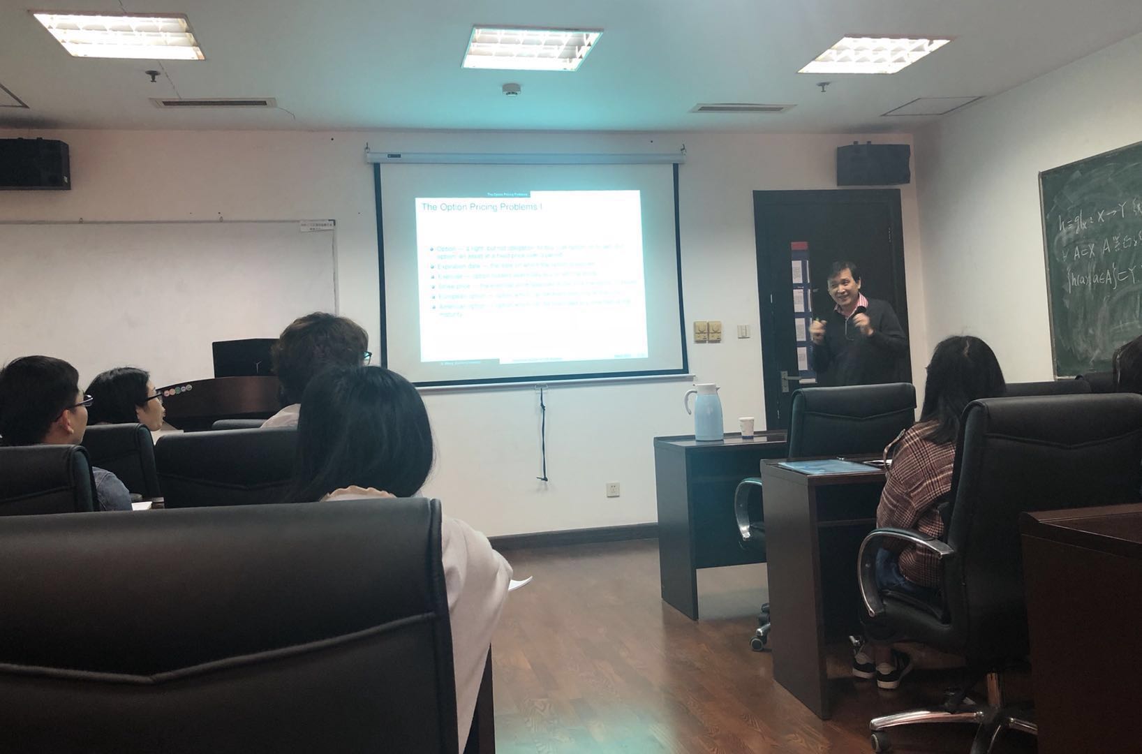 报告中,汪崧教授从经典的障碍问题和金融市场中可交易的各种期权定价问题切入,重点介绍了在无限维和有限维两种维度下的线性和非线性互补问题数值解的一些最新进展。这些进展主要从用于离散化不同类型无限维互补问题或HJB方程的数值方法,以及用于离散化问题的惩罚方法等方面展开,并表明数值分析结果很好地支持了相应的理论发现。汪教授的报告不仅带来了金融工程中HJB方程数值解的最新研究成果,而且丰富了互补问题的应用领域,开阔了大家的视野和思路。报告结束后,汪教授与参加讲座的青年教师和研究生就金融工程、金融统计和最优化等领域的国际前沿和热点问题做了深入的交流与探讨。
