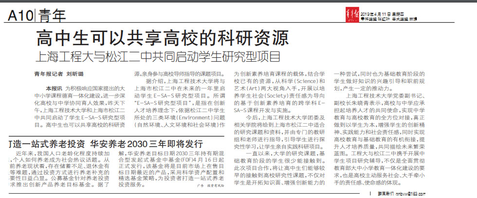 积极响应国家提出的大中小学课程德育一体化建设,进一步深化高校与中学协同育人效果,昨天下午,上海工程技术大学和上海市松江二中共同启动了学生E-SA-S研究型项目。高中生也可以共享高校的科研资源,亲身参与高校导师指导的课题项目。