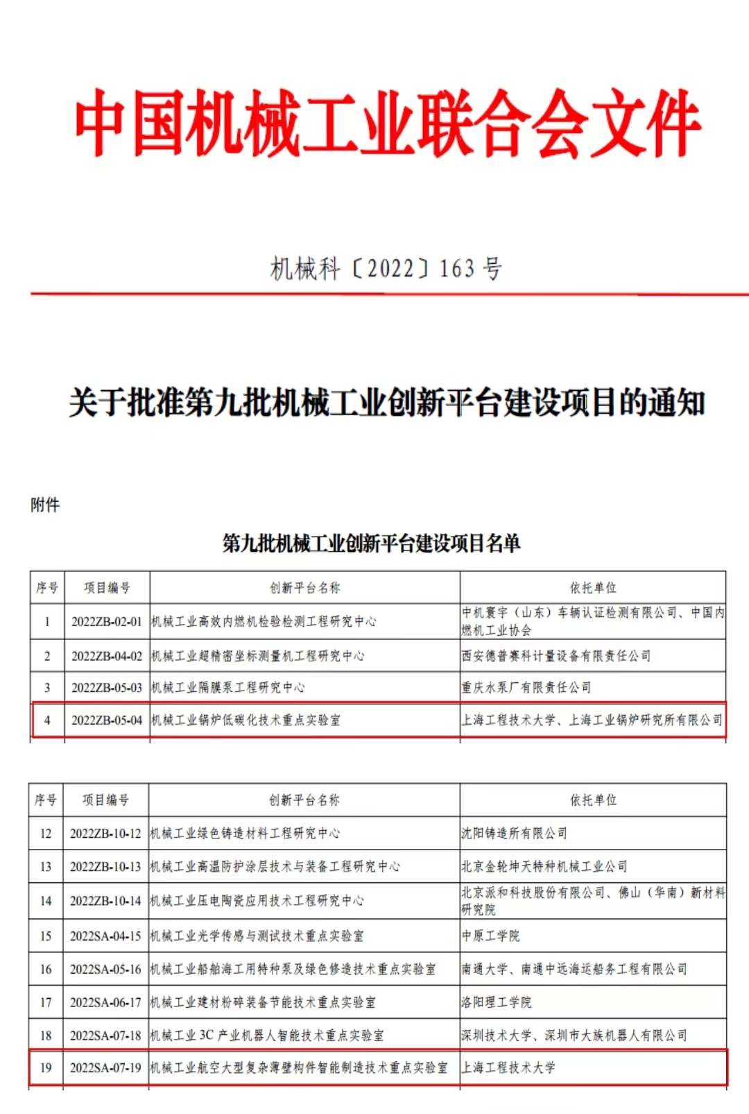 近日,中国机械工业联合会发布《关于批准第九批机械工业创新平台建设项目的通知》(机械科〔2022〕163号),我校机械与汽车工程学院牵头申报的“机械工业锅炉低碳化技术重点实验室”和“机械工业航空大型复杂薄壁构件智能制造技术重点实验室”两个创新平台正式获批,这是我校首次获批机械工业重点实验室,标志着我校科研创新平台申建工作取得重大突破,在相关技术领域处于行业领先地位。