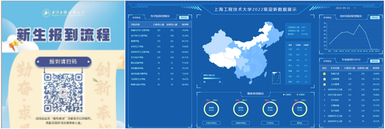 与此同时,信息化办公室(算力中心)还制作了“迎新数据展示”网页,按学院、省市、专业、时段等内容动态显示学生报到情况,并动态刷新数据,让学校师生随时随地获得报到最新信息。