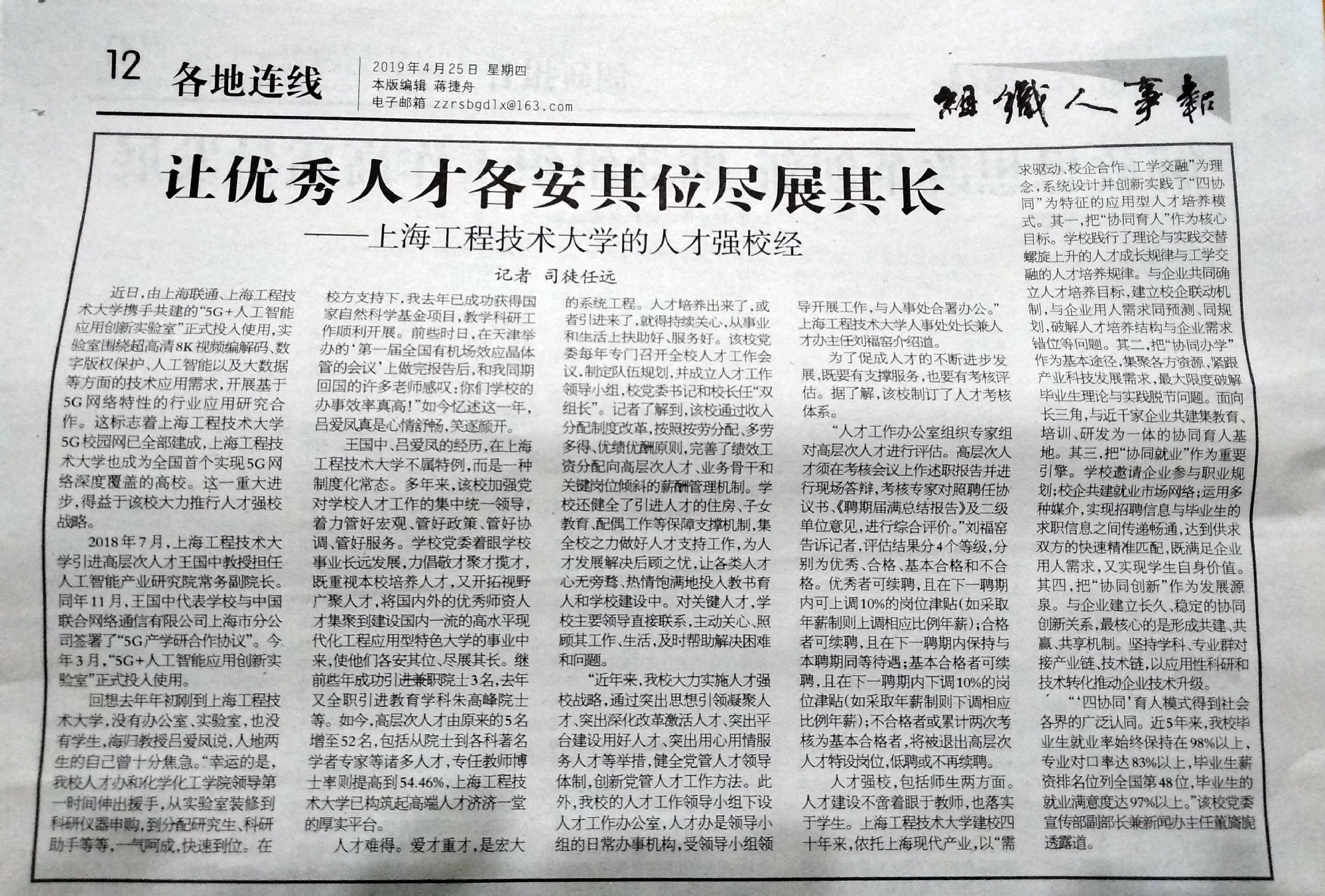 近日,由上海联通、上海工程技术大学携手共建的“5G+人工智能应用创新实验室”正式投入使用,实验室围绕超高清8k视频编解码、数字版权保护、人工智能以及大数据等方面的技术应用需求,开展基于5G网络特性的行业应用研究合作。这标志着上海工程技术大学5G校园网已全部建成,上海工程技术大学也成为全国首个实现5G网络深度覆盖的高校。这一重大进步得益于我校大力推行人才强校战略。