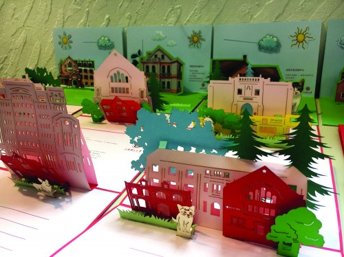 视觉传达设计专业的忻瑜凡的作品是“上理礼品折页包装设计”,这套设计融入了上理的建筑、植物、动物等,再通过激光雕刻的高科技工艺将上海理工大学独特的校园美景展现出来。“我一共设计了三套纸制品:两套立体贺卡,一套立体纸建筑。包装的设计上采用了简约的风格,提取了上理的小元素,然后把它抽象化。”音乐堂、法国文化交流中心……为了栩栩如生地展现这些陪伴了同学们四年的老建筑,她用相机镜头记录下每一个细节,再一笔一笔画下来。就连上理学子都很熟悉的“校猫”也都跃然纸上,别有一番趣味和特有的记忆符号。