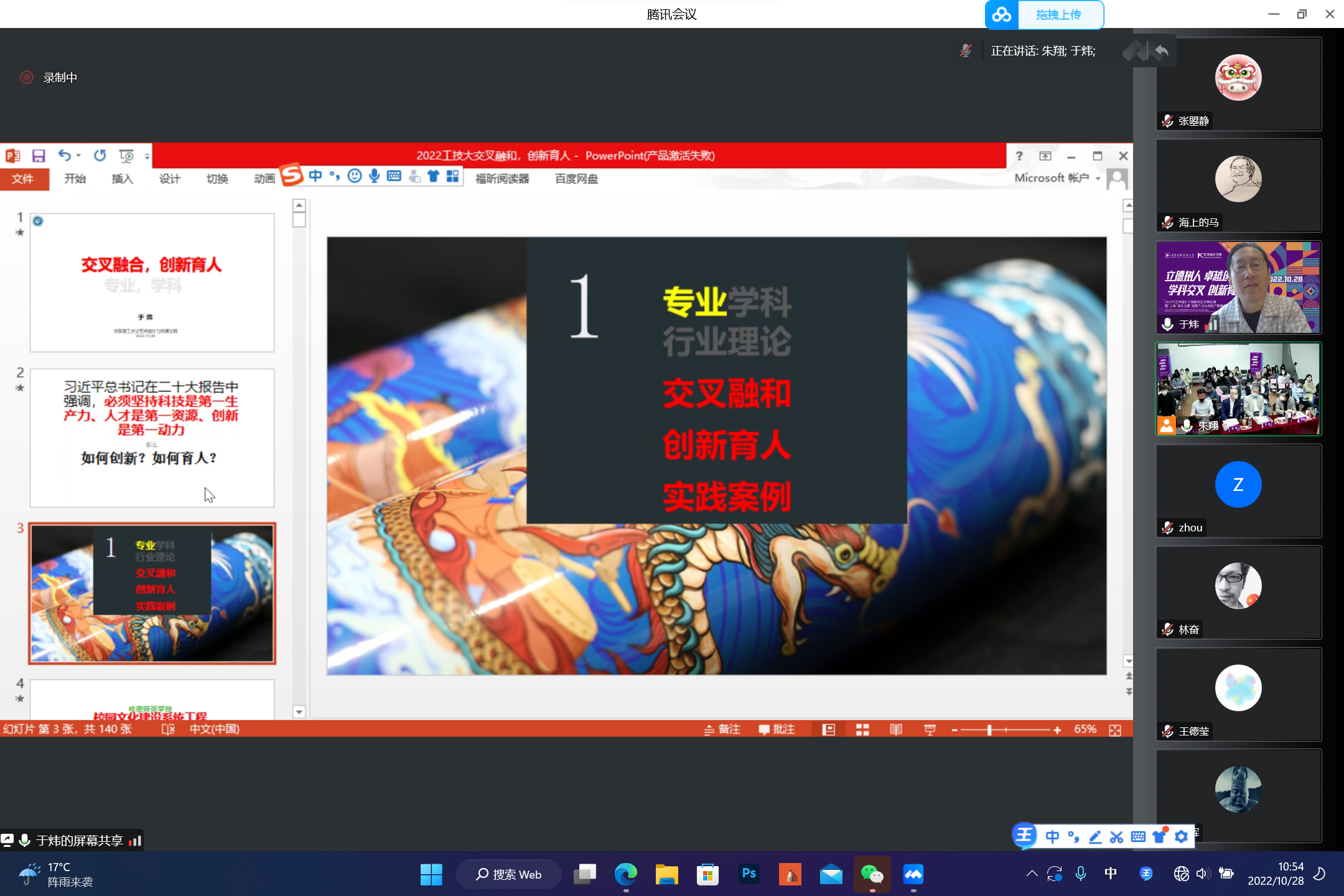 华东理工大学艺术设计与传媒学院副院长、教授、博士生导师于炜演讲《交叉融合,创新育人》,分析专业学科和行业理论,用案例分析学科交叉融合、实践创新育人。