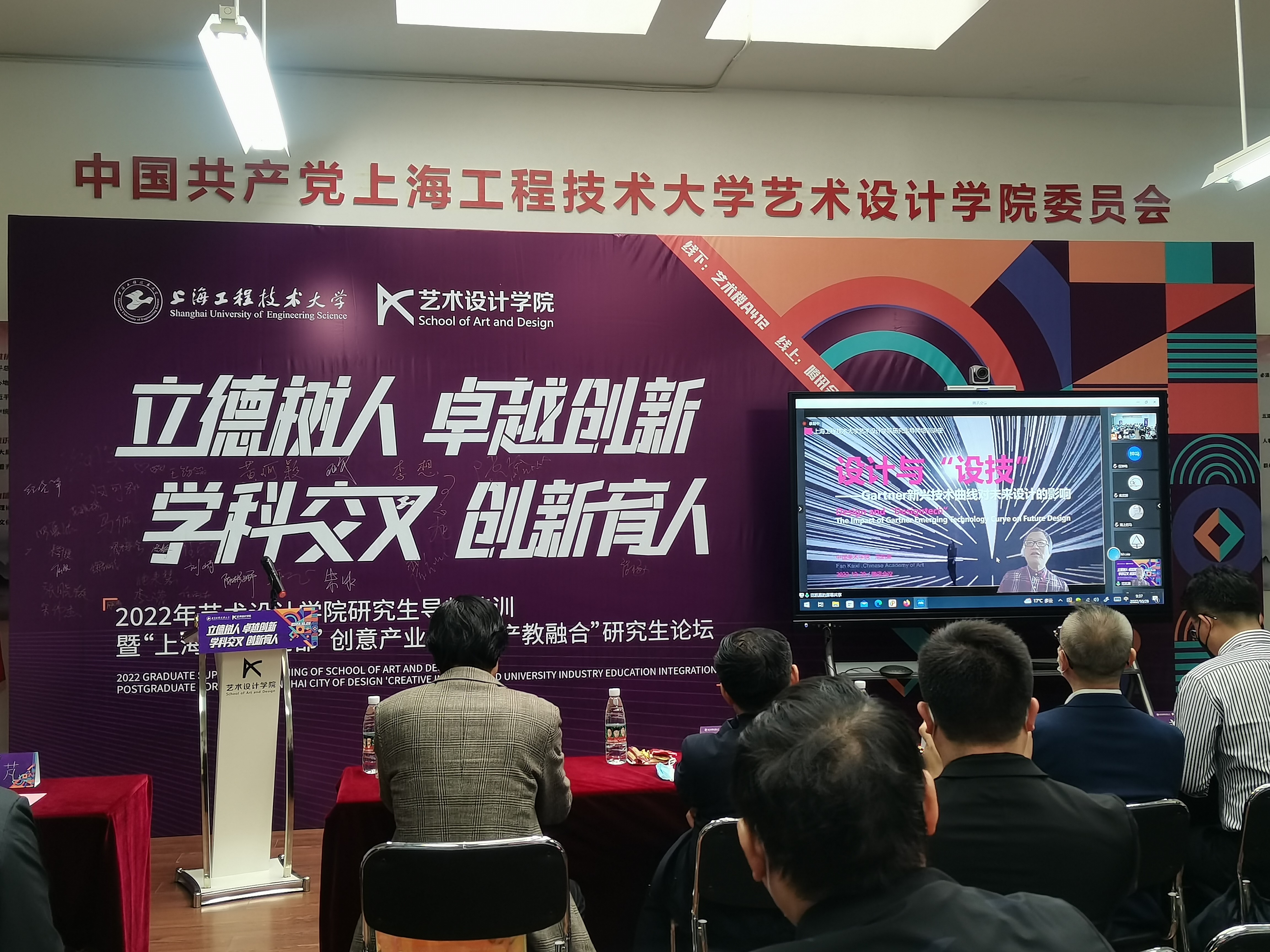 各位专家进行了精彩演讲。中国美术学院教授、博导、教育部高等学校社会科学发展研究中心研究员范凯熹教授演讲《设计与设技——Gartner新兴技术曲线对设计进化的研究》,重点强调“技术决定一切,决定未来”的“技术决定论”观点,指出技术是自主的,技术变迁导致社会变迁,技术是决定社会发展的唯一因素。