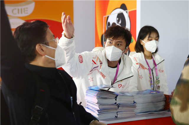 2019年,张骞通过学校招募,成为第二届进博会“小叶子”,负责场馆内国际贸易窗口的服务。如今,已经成为研一学生的张骞再度赴约,成为会场西登录厅现场引导咨询岗位志愿者。他和同组小伙伴们迎接最早一批到来的宾客,直到场馆闭馆宾客离去才离岗。
