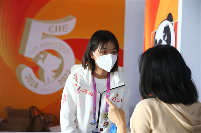 除了第二届进博会把脚摔伤了以外,第一、三、四、五届进博会伴随着黄倩仪从本科生到研究生,从入党积极分子、预备党员再到正式党员,从“小叶子”到“小叶子”讲师团一员的全过程。这一次,她升为“四年级生”,成为会场西登录厅现场引导咨询岗位志愿者。
