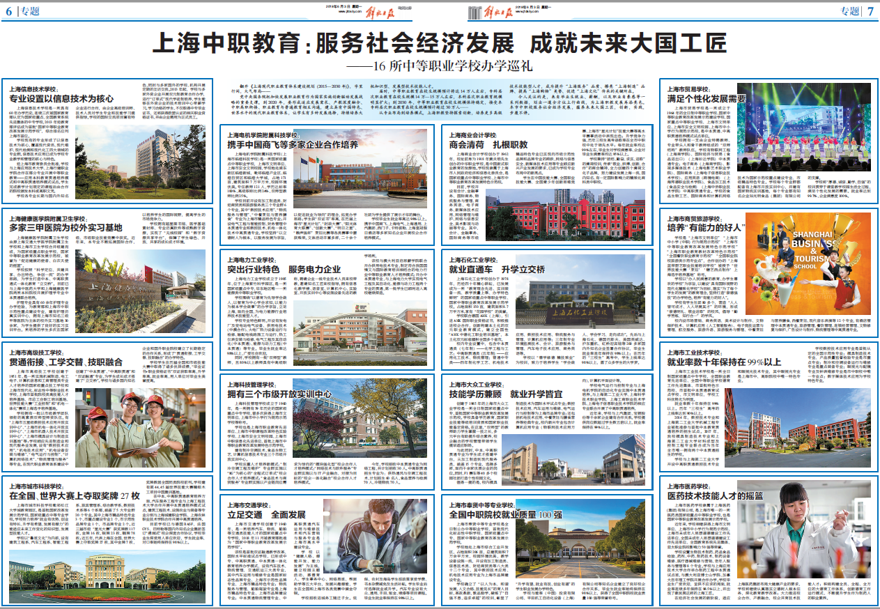 6月3日,《解放日报》第7版刊载题为“上海中职教育:服务社会经济发展 成就未来大国工匠——16所中等职业学校办学巡礼”文章,报道上海市高级技工学校,贯通衔接、工学交替、技职融合的情况介绍,内容如下:
