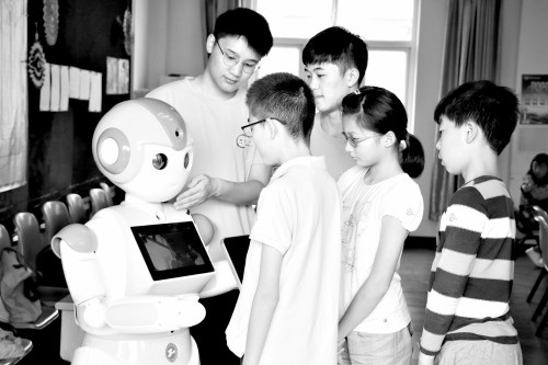 小朋友们刚刚踏进教室,就被门口1.6米高智能机器人所吸引,停下了脚步。在暑托班志愿者的引导下,记录的影像都呈现在它胸前的屏幕上,同学们纷纷探头过去留影,让他们惊奇的是当他们的脸出现在屏幕中时,屏幕的左上角自动捕捉了他们的人脸信息,并显示了他们的名字。