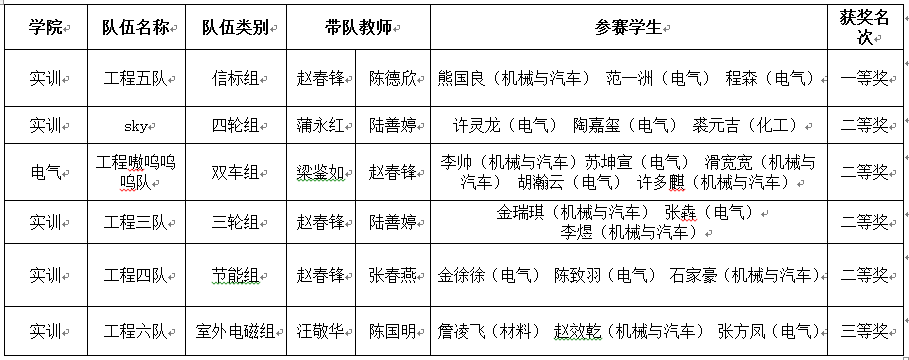 从去年12月大赛开始以来,教务处、工程实训中心领导高度重视,工程实训中心于5月12日圆满开展校级预选赛。在教务处及相关学院的关心支持下,工程实训中心赵春锋、陈德欣指导的信标组获得一等奖,蒲永红、陆善婷指导的四轮组获二等奖,赵春锋、陆善婷指导的三轮组获二等奖,电子电气工程学院梁鉴如与工程实训中心赵春锋指导的双车组获二等奖,工程实训中心赵春锋与机械与汽车工程学院张春燕指导的节能组获二等奖,工程实训中心汪敬华、陈国明指导的室外电磁组获三等奖。