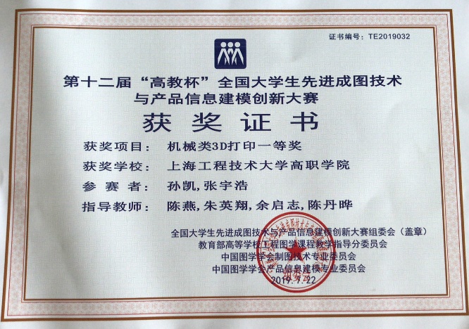 2019年第十二届“高教杯”先进成图技术大赛于7月22日落下帷幕,经过激烈角逐,上海工程技术大学高职学院由陈燕、朱英翔、余启志、陈丹晔担任指导老师,孙凯、张宇浩同学组成的参赛队勇夺“机械类3D打印”项目团体一等奖,陈吉平同学荣获个人三等奖。这也是高职学院基础教学部制图教研组参加该项以来,连续两年荣获全国赛团体一等奖。