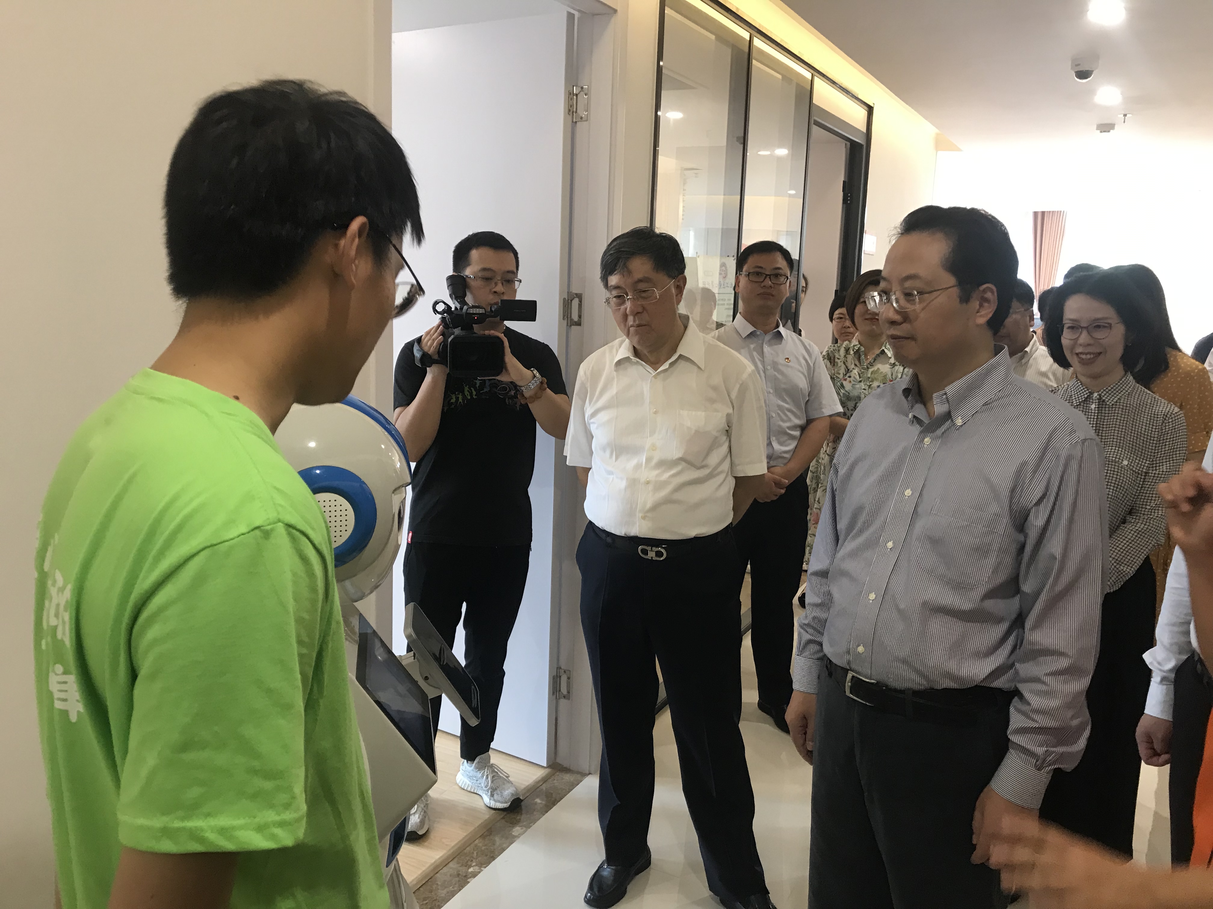 上午,潘敏主任一行来到松江区青年中心,看望了正在多媒体教室和报告厅授课志愿者们,他与每一位志愿者一一握手,关心志愿者们的工作安排和生活保障,并给他们送上了慰问用品。潘敏主任饶有兴致听取了我校结合学科优势、专门为此次爱心暑托班设置的智能人脸识别签到机器人的介绍,肯定了智能机器人优化暑托班出勤签到、增强趣味性、科学性的丰富功能。潘敏表示,志愿服务工作在新时代文明实践中心建设中发挥了不可或缺的重要作用,是践行社会主义核心价值观的重要载体,他鼓励大学生志愿者们进一步发扬“奉献、友爱、互助、进步”的精神,为实现“两个一百年”奋斗目标、实现中华民族伟大复兴的中国梦贡献力量。