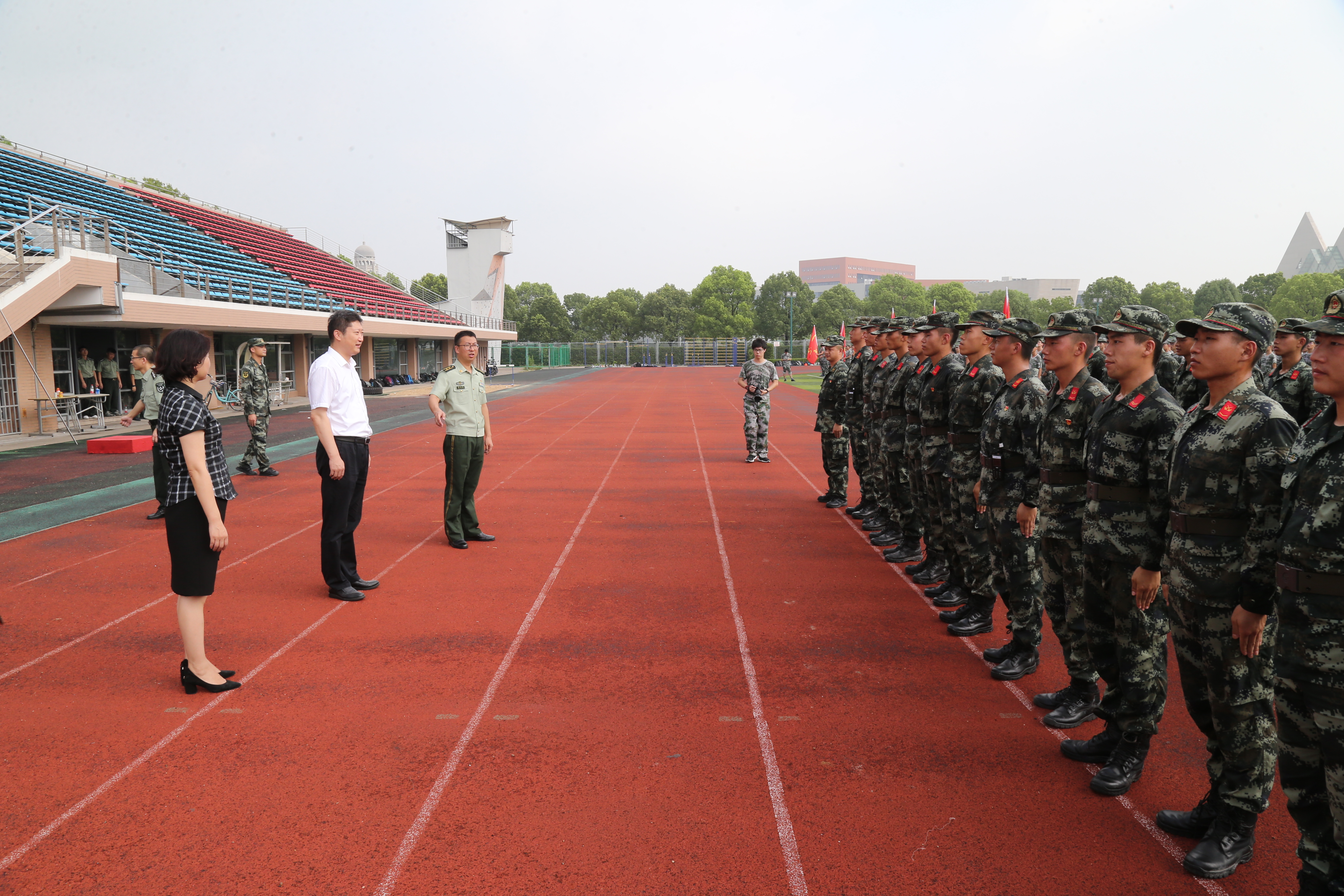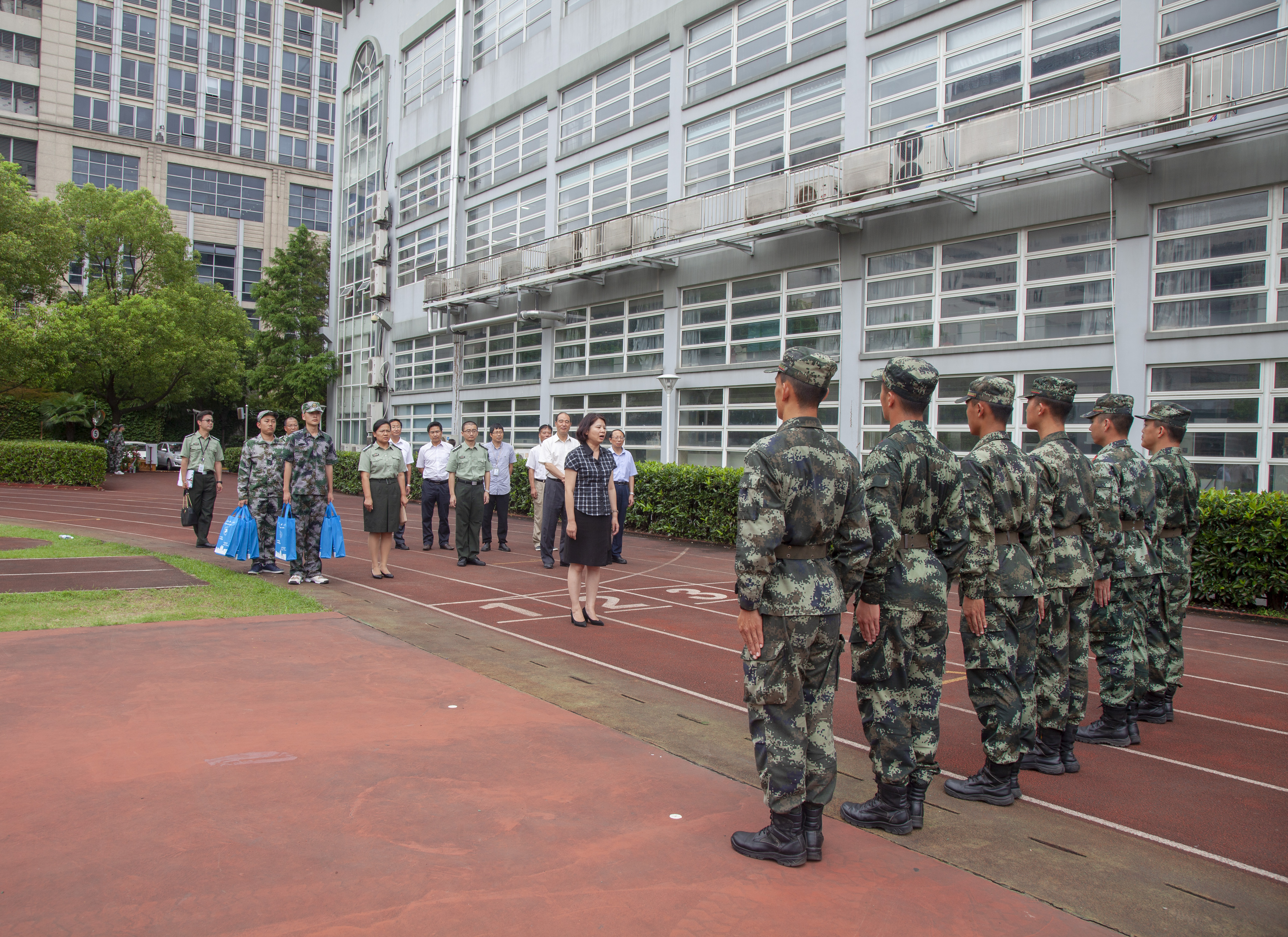 8月28日上午,校党委书记李江,校党委副书记、副校长朱晓青,副校长姚秀平、夏春明到军训营地走访慰问了承训教官及全体参训学生。