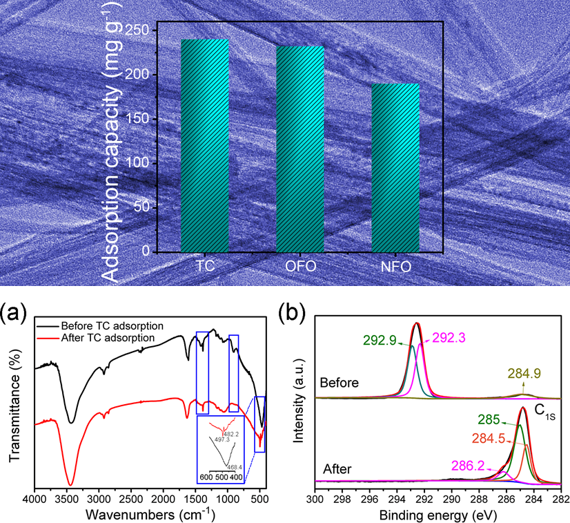 伴随社会环保意识的加强,抗生素污染问题已经越来越得到社会各界的注意。然而,目前依然有大量的残余抗生素对水体造成污染,针对这类问题研发出一种吸附量高,污染性小的吸附剂具有十分重要的研究意义和社会价值。王哲、唐红梅所在的材料工程学院李文尧副教授课题组,长期从事无机非金属吸附材料的研究工作,开发出一系列以二氧化钛为主体的抗生素吸附材料,并对其复合物针对抗生素的吸附机理进行全面的研究。该课题组基于之前研究钛酸超长纳米管的基础上,选用无水乙醇作为碳源,将其均匀的复合在超长二氧化钛表面形成一层超薄的碳层。合成的TiO2@C复合材料,其表面的碳结构经过拉曼表征具有低石墨化结构特征。此外,TiO2@C复合材料针对不同浓度的抗生素能够吸附三种不同类别的抗生素,包括四环素、氧氟沙星和诺氟沙星。吸附结果表明,与单一无机吸附材料相比,复合材料的吸附性能得到了极大的提高。其吸附数据经过拟合后表明其吸附机理与Langmuir拟一级动力学模型一致。该结果与进一步热力学计算结果一致,即该复合材料吸附抗生素的吸附过程主要是物理吸附。