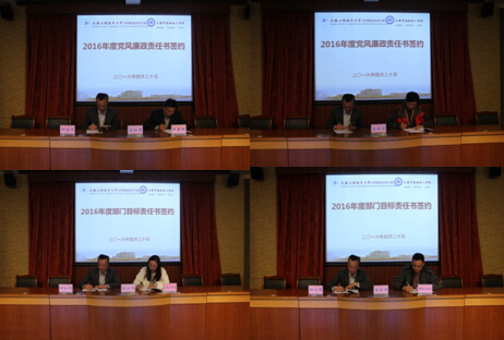4月20日上午,高职学院 “2016年度党风廉政建设责任书签约暨部门目标责任书签约”仪式在综合楼九楼第二报告厅召开。会议及签约仪式由学院、校党委书记柳如荣同志主持,全体中层干部出席了会议。