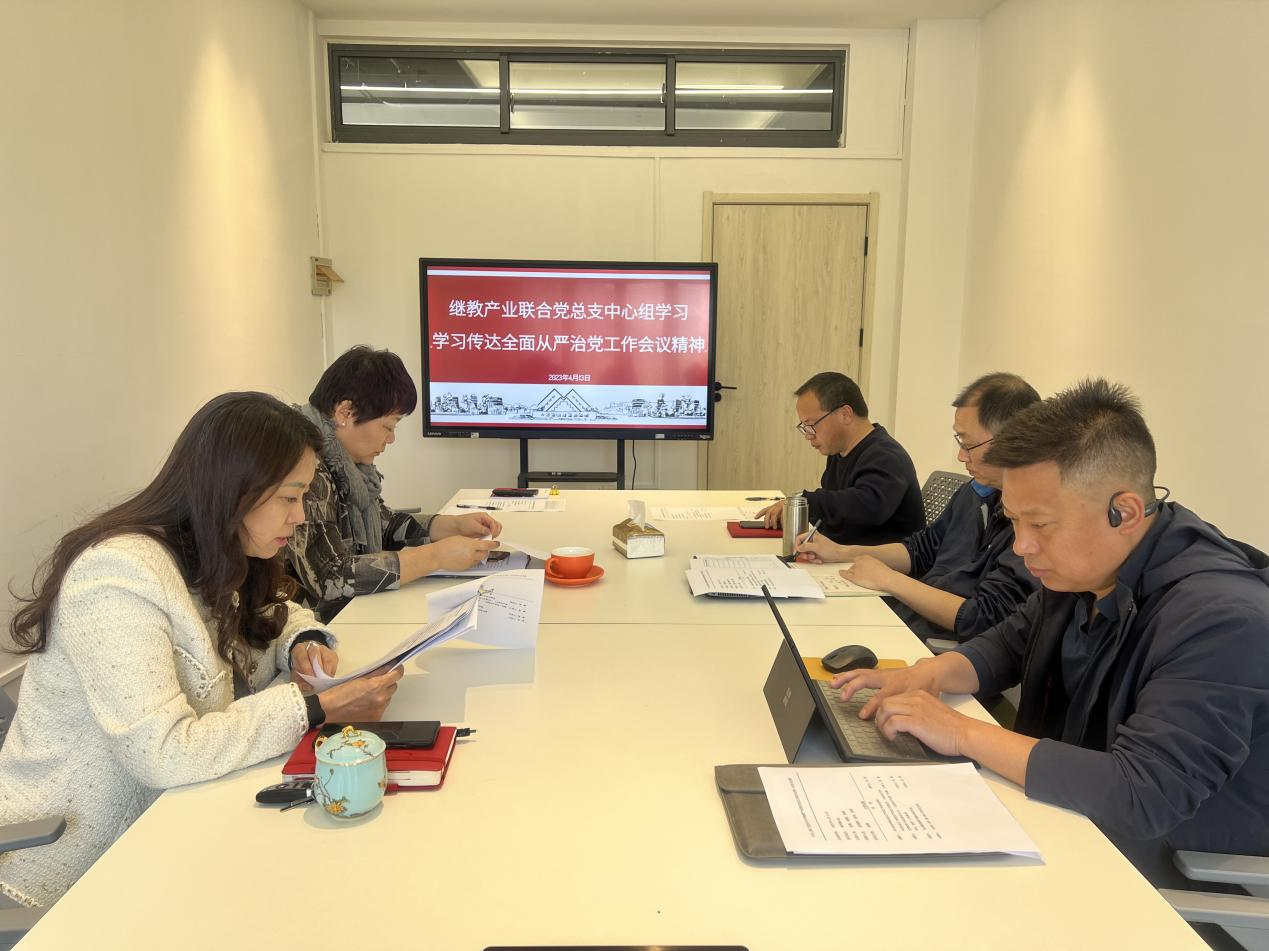 4月13日上午,继教产业联合党总支在长宁校区教学楼404召开中心组学习,传达学校全面从严治党工作会议精神。继教产业联合党总支中心组全体成员出席,会议由党总支书记袁蓉主持。
