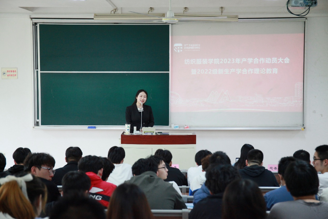 4月14日,纺织服装学院在教学楼F102举行2023年产学合作教育动员大会暨2022级新生产学合作理论教育,学院党委副书记谢志霞、产学合作辅导员刘朝芳、校友辅导员任凡、纺织工程专业辅导员闵语涵,2022年产学合作优秀学员以及2022级产学合作全体学生参加会议。