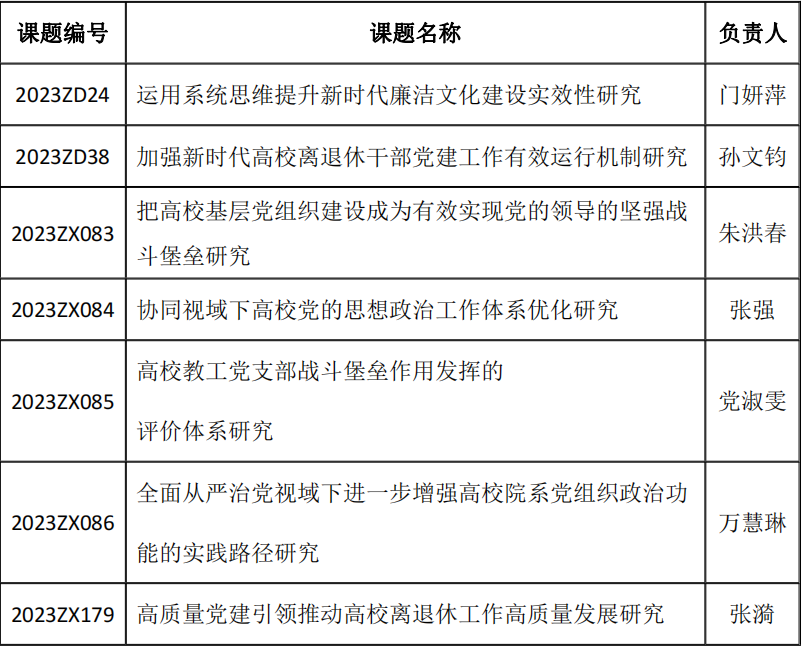 同时,市教卫工作党委系统党建研究会秘书处发布通知(沪教卫党研[2023]3号),经过市教卫工作党委系统党建研究会秘书处和专业委员会专家评审,我校共有7项课题获得2023年市教卫工作党委系统党建研究会课题立项资助,其中2项重点课题立项。