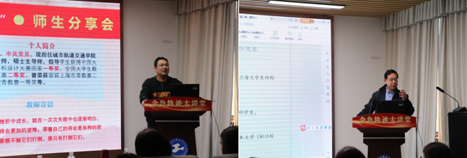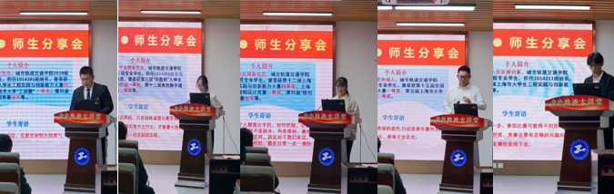铁道工程学生党支部学生党员、上海市大学生工程实践与创新能力大赛特等奖获得者、校大学生年度人物吴文涛,全国大学生数学建模竞赛一等奖获得者贺暖雯,上海市大学生工程实践与创新能力大赛特等奖、校结构设计大赛一等奖、第四届“程创杯”创业计划竞赛银奖获得者熊承莉,全国大学生结构设计大赛一等奖获得者龚文龙,上海市大学生工程实践与创新能力大赛特等奖获得者卓晟贤等5位同学结合自己的参赛经历,向同学们分享了自己的成长历程。