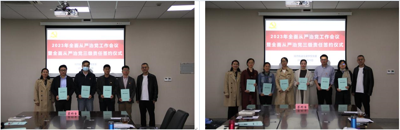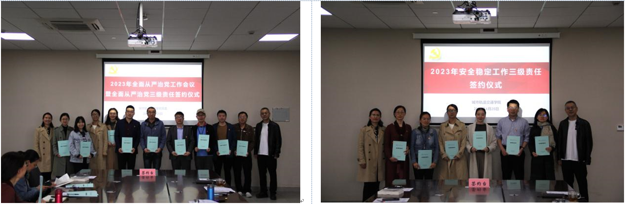 会上,学院全体党政领导班子、工会主席、各系室主任、全体支部书记共同签署了《城市轨道交通学院党委2023年全面从严治党责任书》和《城市轨道交通学院2023年安全稳定责任书》。