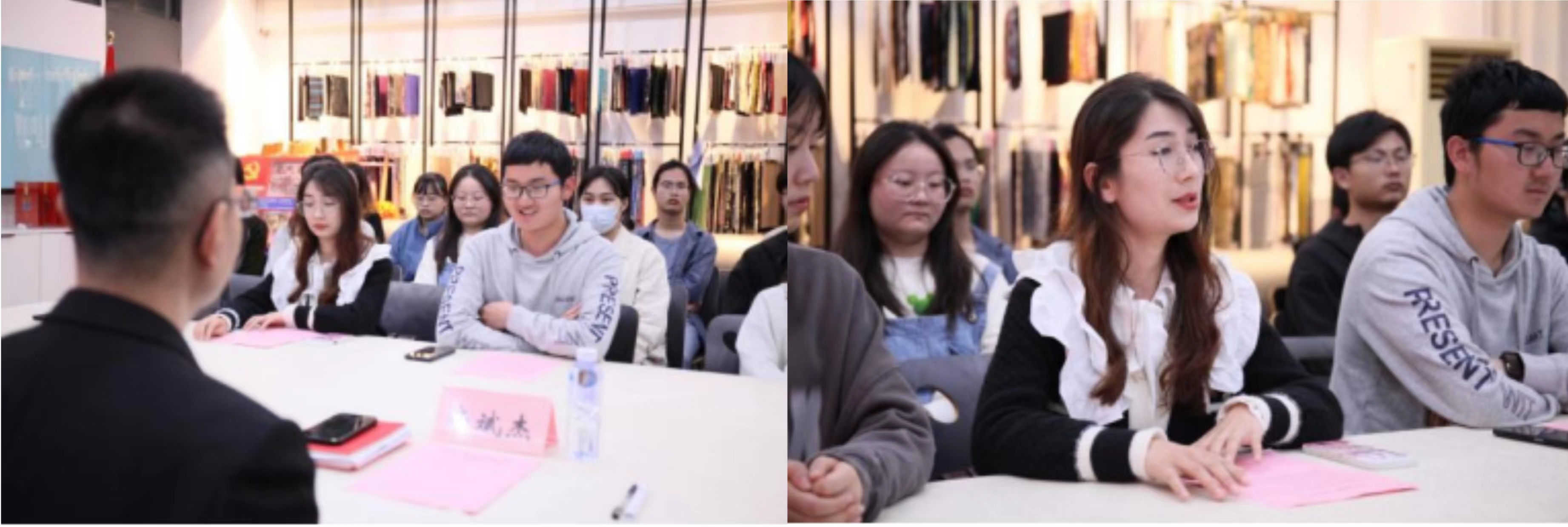 纺织工程专业考研学生代表胡胜、服装设计与工程专业团学骨干代表廖逸山、民族生代表哈丽美热·阿布力孜相继作主旨发言,报告了学习现状与思想动态。会上师生间进行了充分的自由交流,同学们纷纷结合自身经历为学院出谋划策,参会老师也热情地一一回应。