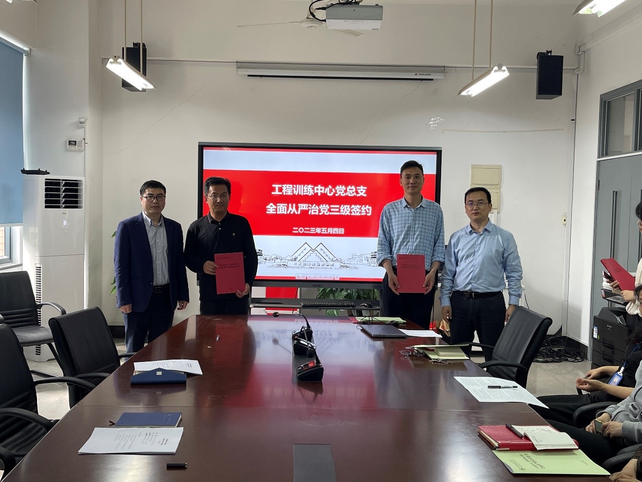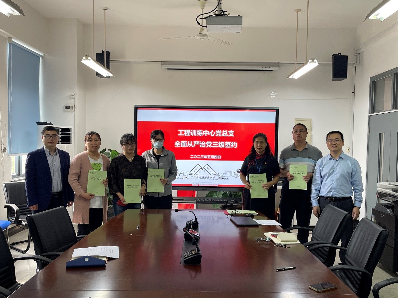 会上还举行了工程训练中心党总支全面从严治党三级签约仪式。王成涛、陈浩代表中心党总支分别与中心副主任、各室部主任签订了全面从严治党责任书。