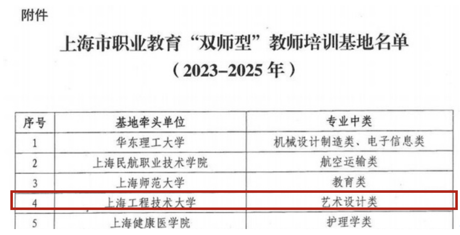 近日,上海市教育委员会发布《关于公布上海市职业教育“双师型”教师培训基地(2023-2025年)的通知》(沪教委人〔2023〕13号),我校成功入选上海市职业教育“双师型”教师培训基地,专业种类为艺术设计类。