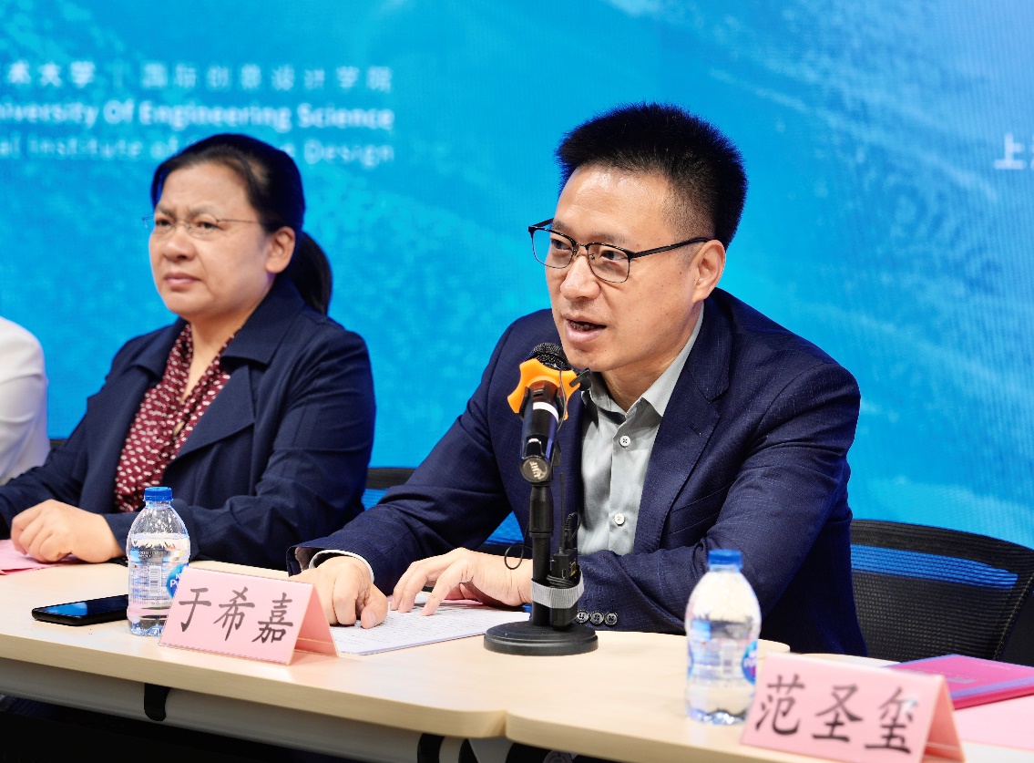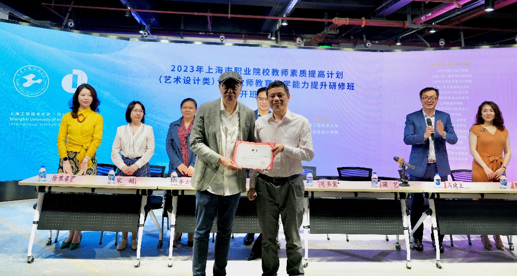 上海工程技术大学人事处副处长、人才办副主任宋娟老师和国际创意设计学院院长顾艺分别介绍了项目情况及相关课程设置情况。(艺术设计类)专业教师教育教学能力提升研修班项目是上海市教育委员会遴选确定的2023年上海市职业院校教师素质提高计划国家级培训项目。本次研修班于5月至11月面向职业院校骨干教师、专业带头人、管理者,开展专家讲座、分组研讨、工作坊训练以及企业实践教学等内容丰富的专题培训。研修班邀请了上海艺术设计界的知名教授、行业专家为学员分享丰富的专业知识和教育教学经验;邀请了设计类学科竞赛的组委会专家开展研讨,探索更有效的教学方法和指导方式。最后顾艺院长为授课教师代表同济大学范圣玺教授颁发聘书。