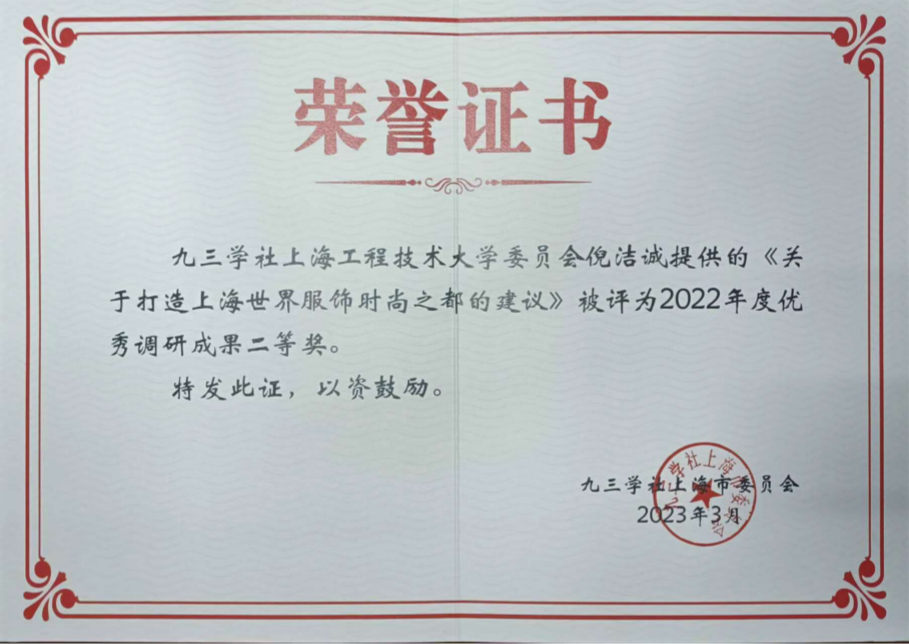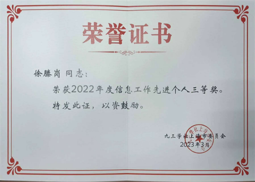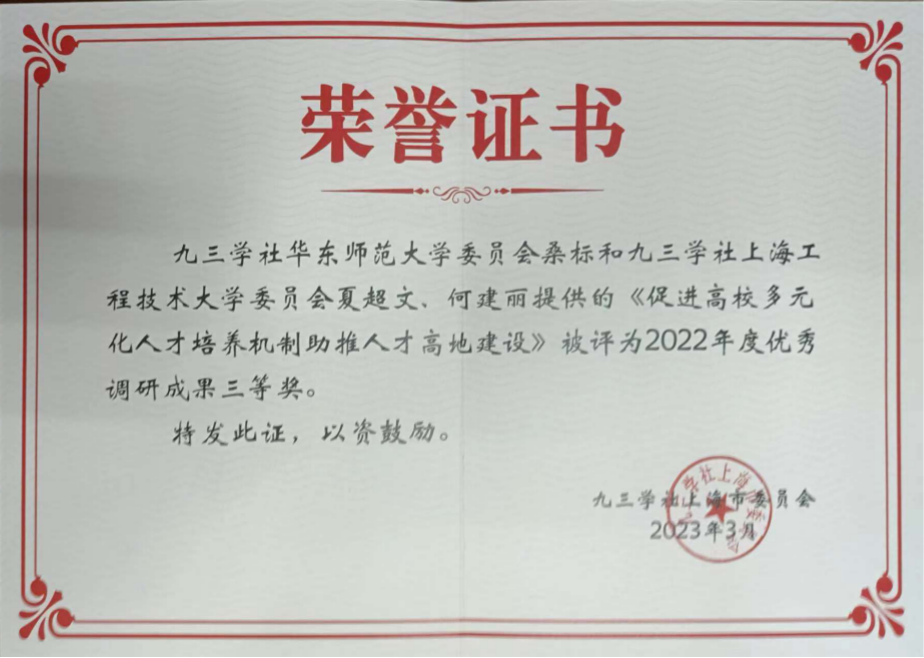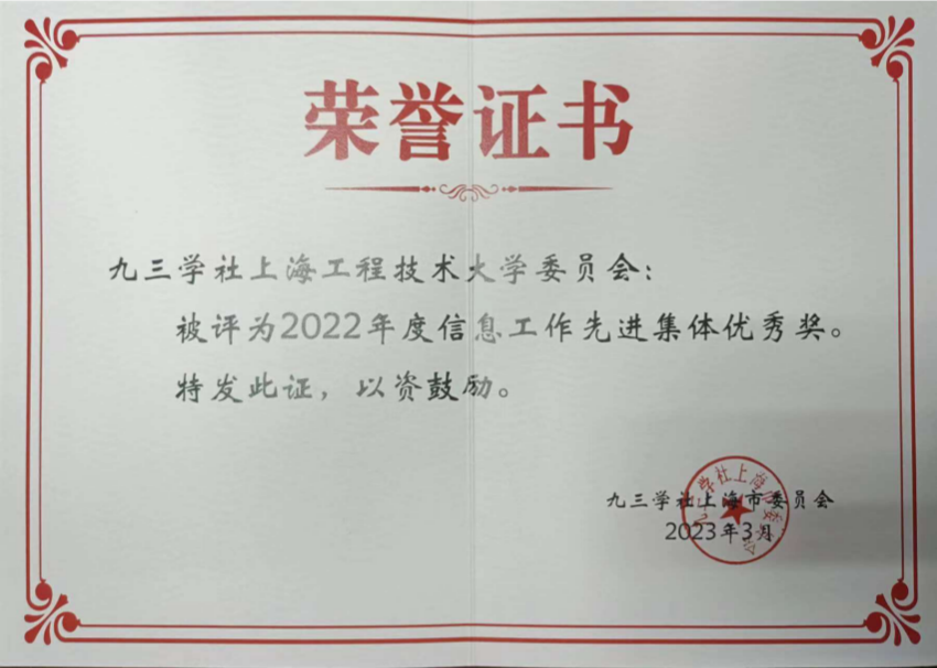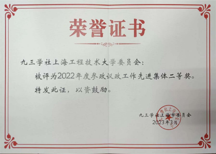 九三学社上海工程技术大学委员会获2022年度参政议政工作先进集体二等奖、2022年度信息工作先进集体优秀奖表彰,徐滕岗同志获2022年度信息工作先进个人三等奖、倪洁诚的课题获2022年度优秀调研成果二等奖、夏超文和何建丽共同参与执笔课题获2022年度优秀调研成果三等奖。