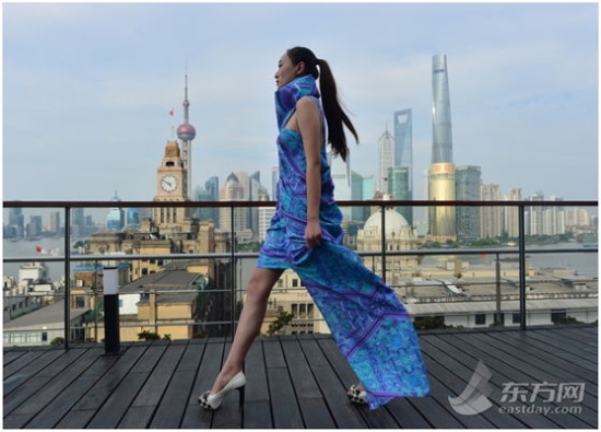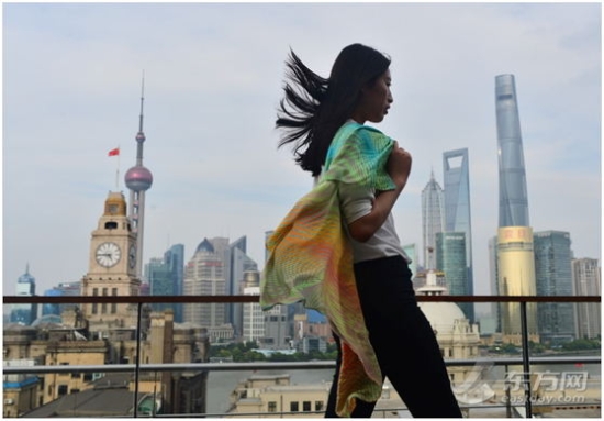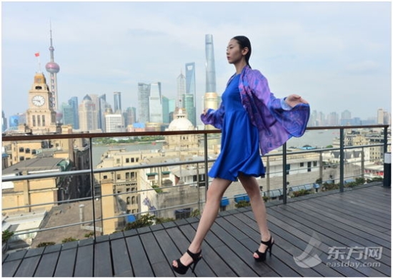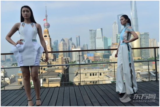 2016年6月18日,上海。一场以“时尚城市”为主题的时装秀亮相黄浦江畔外滩的一个楼顶秀场。上海工程技术大学中法埃菲时装设计师学院的大学生模特身着该院学生设计的作品,利用印花、线条等元素,以黄浦江和外滩建筑群为背景,从时尚的角度对城市空间进行跨界探索和演绎。