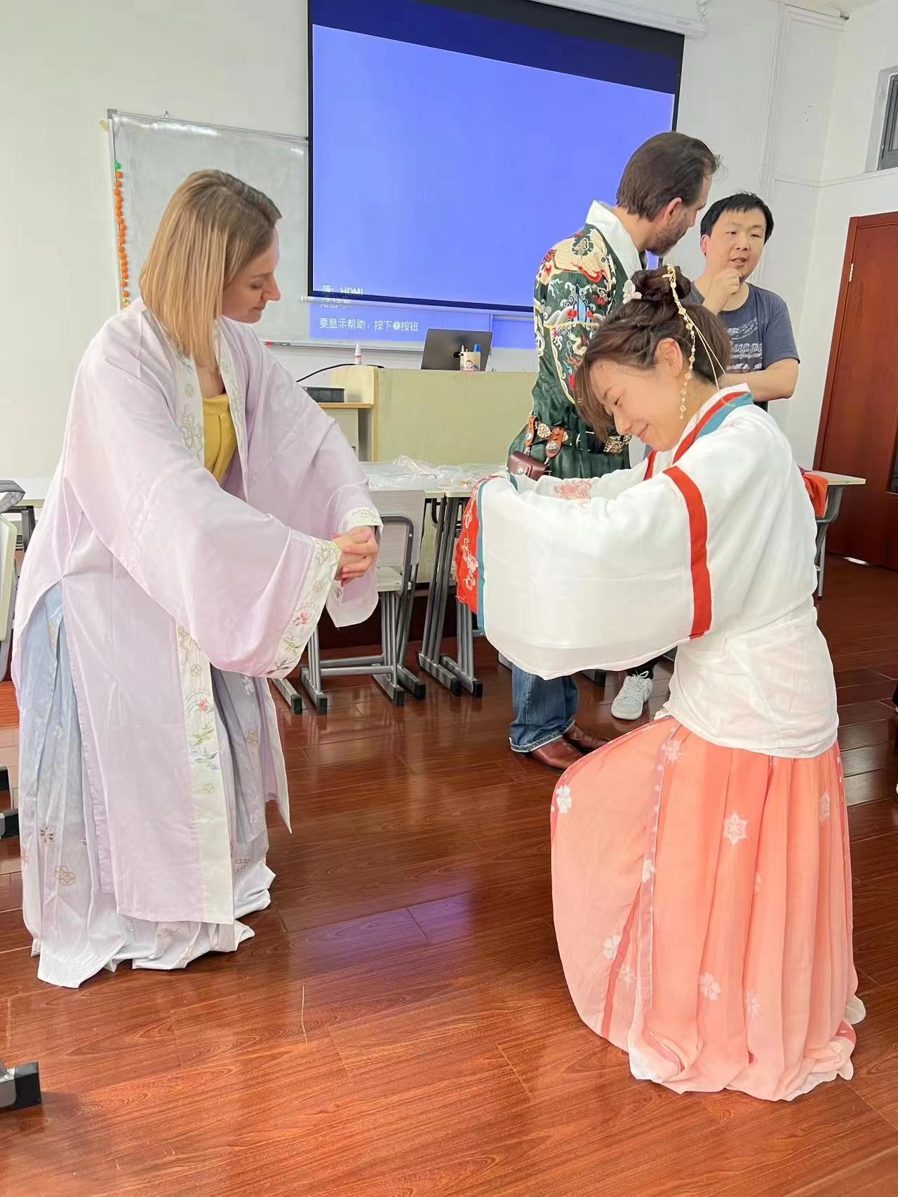 活动中,国际学生们通过视频和实物展示等多种方式,了解汉民族传统服饰的历史发展和演变,以及服饰中体现的中华文化和中华智慧。学生们穿上汉服,认真学习中华传统礼仪,在教室里上演了一场汉服礼仪“大秀”,赢得了一片叫好和掌声。