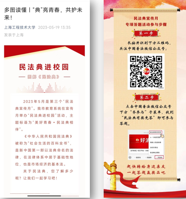 宣传月期间,学校开展了“民法典进校园”系列活动:多渠道张挂、投放“美好青春,民法典相伴”主题标语;官微推送《民法典》社会热点问题解读;组织师生参与专项答题活动;提供法律咨询服务。通过系列活动的开展,切实加强对民法典的学习宣传,增强师生法治意识和法治信仰,营造尊法、学法、守法、用法的良好法治氛围,为学校高质量发展提供法治保障。