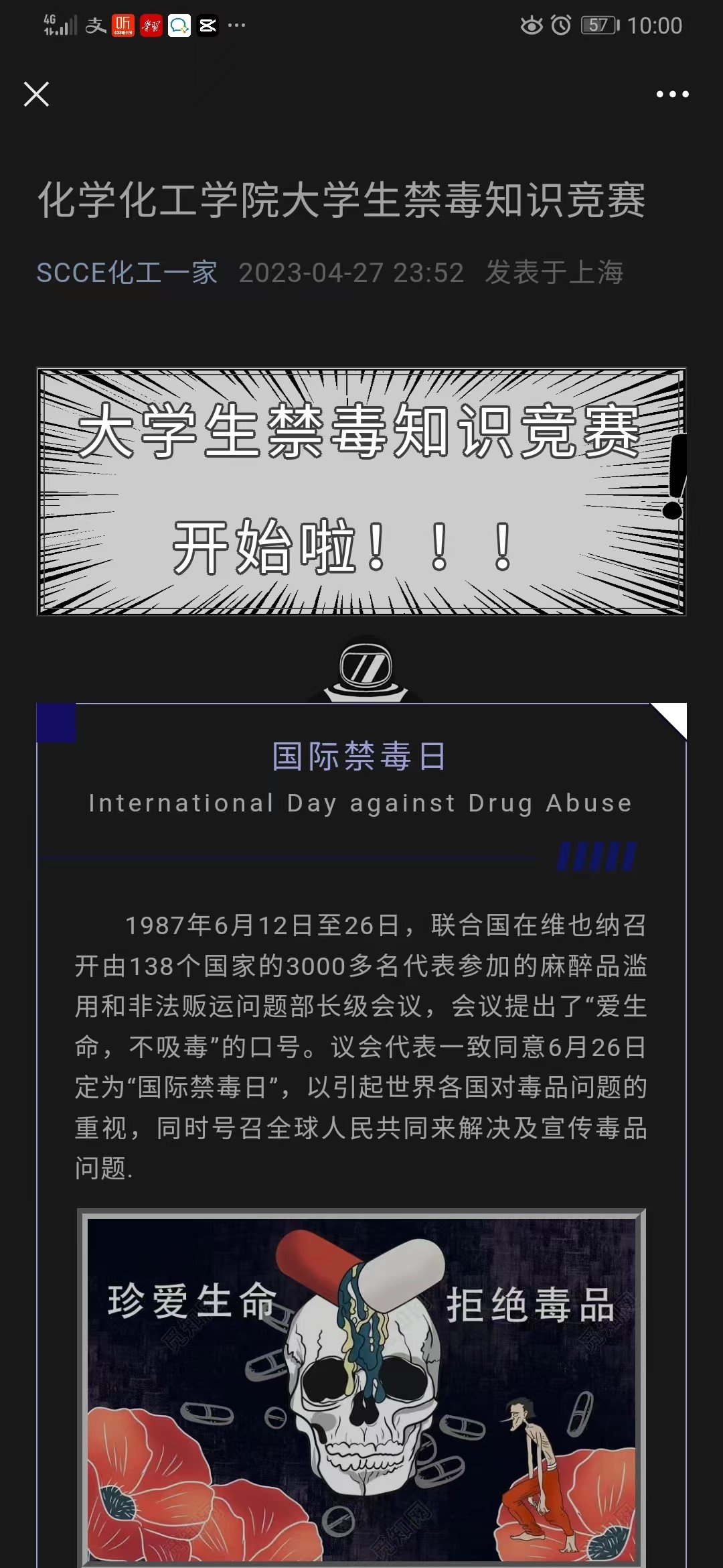 为进一步增强学生的法制观念和识毒、防毒、拒毒意识,提高师生防范毒品侵害的能力,在第36个国际禁毒日来临之际,化学化工学院召开了“筑牢禁毒防线,共创健康校园”系列禁毒宣传教育活动。