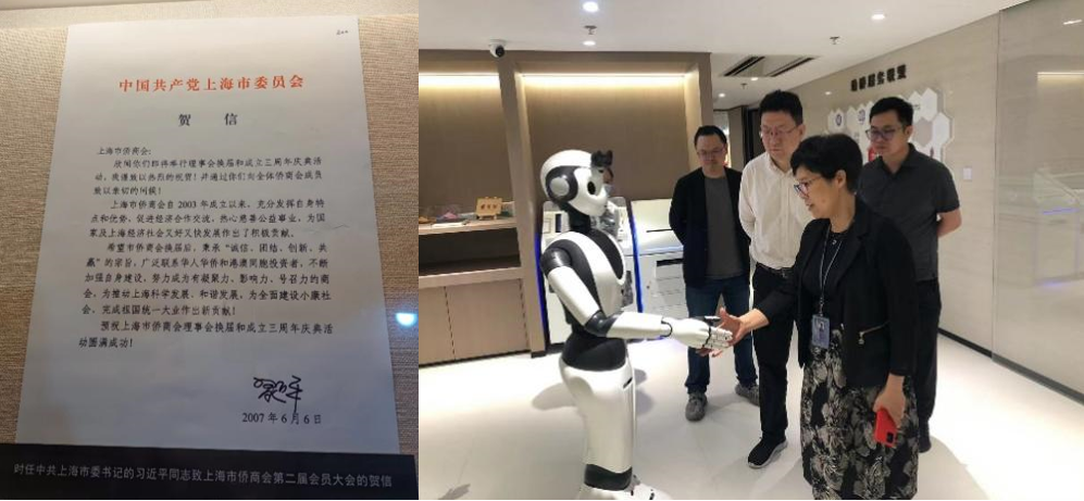 陈列展中收藏了一封2007年时任上海市委书记的习近平同志写给上海市侨商会的一封贺信,这让到访的新侨成员倍感亲切,大家为华人华侨的凝聚力、影响力和号召力而深受鼓舞。此外,在上海市华侨事务中心的前厅摆放了一台由归国华侨团队研发的智能机器人“小侨”,“小侨”能歌善舞,热情奔放,合影还会摆拍,引发在场人员的强烈好奇和不断互动。