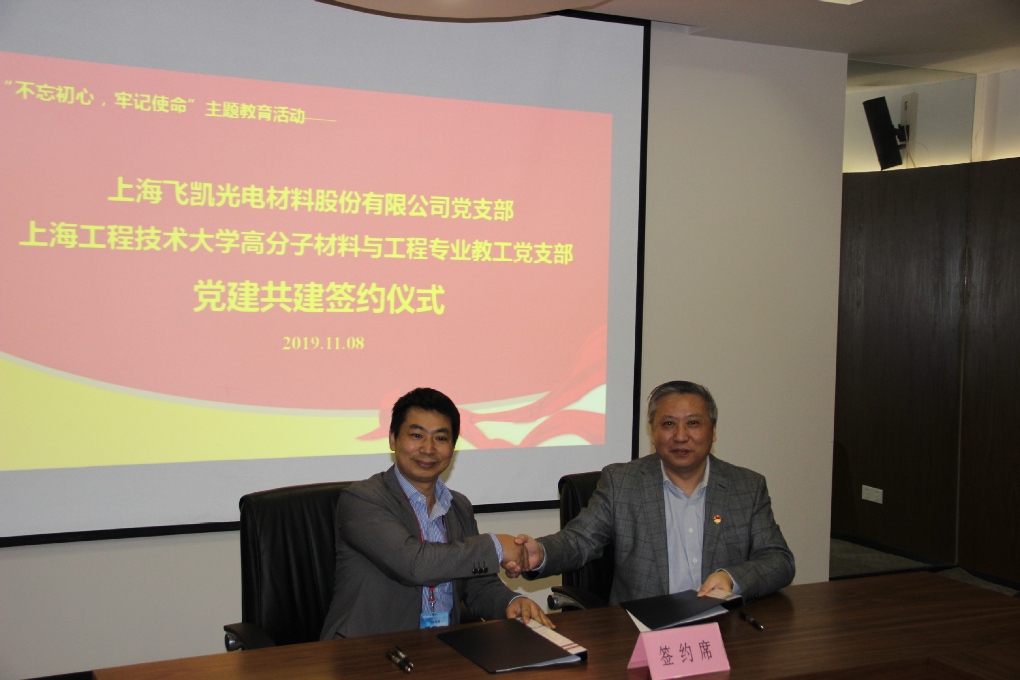 11月8日上午,上海工程技术大学高分子材料与工程专业教工党支部全体党员来到上海飞凯光电材料股份有限公司,与公司党支部联合开展了“不忘初心、牢记使命”主题教育系列活动,举行了党建共建签约。会前还参观了公司展厅,了解企业产品类型,技术开发情况。会议由上海飞凯光电材料股份有限公司副总经理、党支部书记兼工会主席徐鹏文主持。