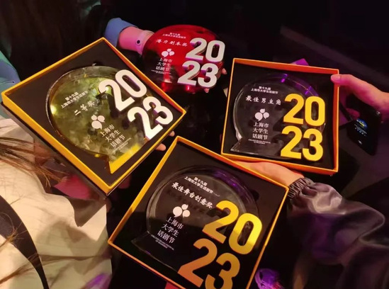 在刚刚结束的第十九届上海市大学生话剧节闭幕式上,学校梦工场话剧团再次获得多项荣誉:长剧组团体二等奖(全市仅一项)、最佳舞台创意奖、最具潜力剧本奖、最佳男主角、优秀个人表演奖五项桂冠。几张奖状无法体现梦工场话剧团成员们的全部付出,台上短短几十分钟的背后是成员们竭尽全力所带来的成果。