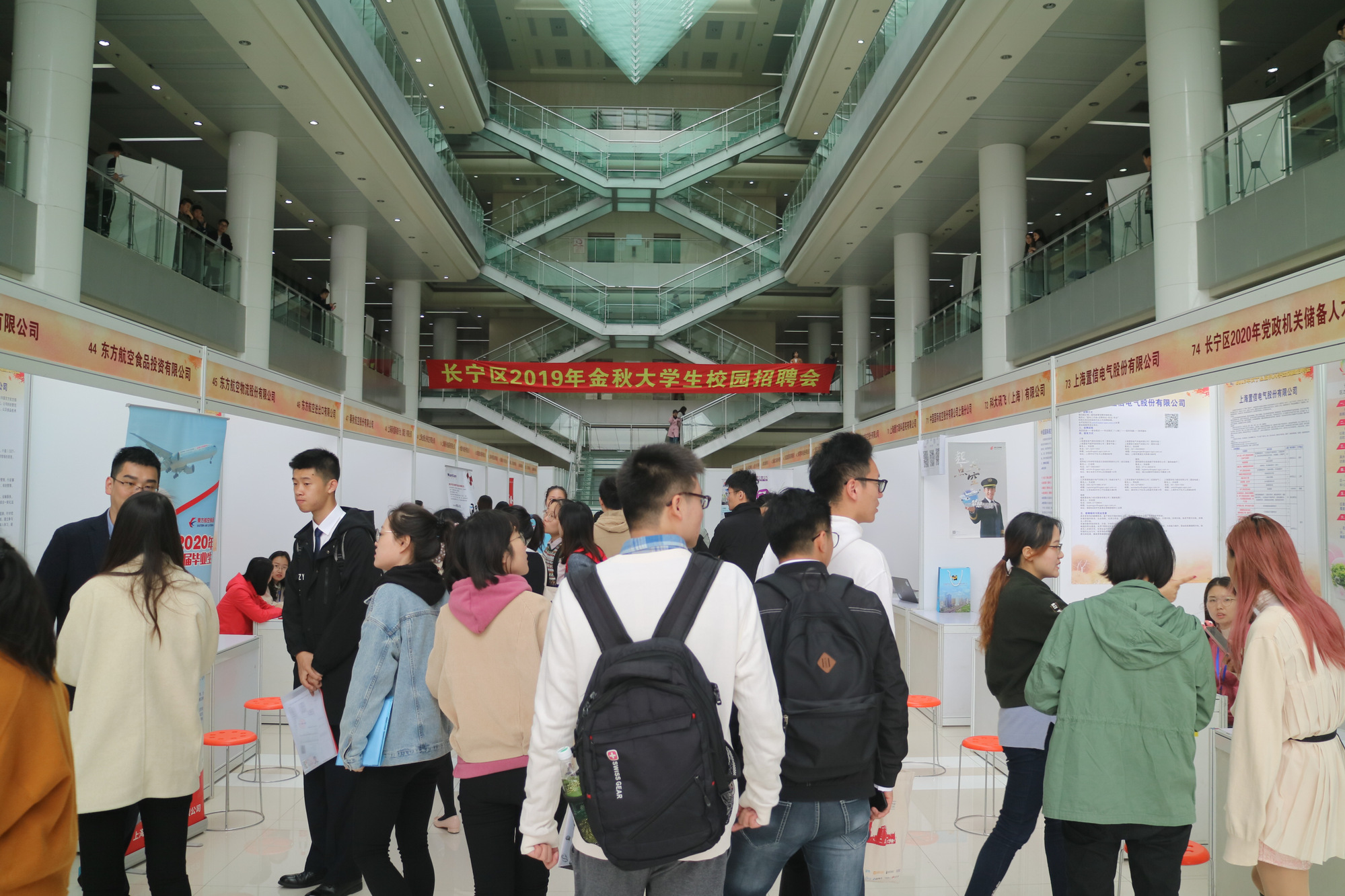 本次大型招聘会共有224家用人单位前来设摊招聘,招聘会突出发展长宁区三大支柱产业,涉及航空服务业、金融服务业、人工智能、互联网+、创业园企业、时尚产业及综合类企业,提供了5000余个岗位供毕业生选择,吸引了近5000名学生前来应聘。各学院负责就业工作的专职教师积极与企业对接,加强交流与沟通,主动为企业推荐毕业生。毕业生对各家企业提供的岗位也表现出极大的热情,企业摊位前都排起了长队,毕业生积极与企业HR沟通交流,简历投递现场异常火爆。参加招聘会的同学们十分感谢学校提供如此多的就业机会,面对严峻的就业形势,同学们纷纷表示要保持积极的就业心态,珍惜各类工作机会,力争早日找到适合自己的工作岗位。