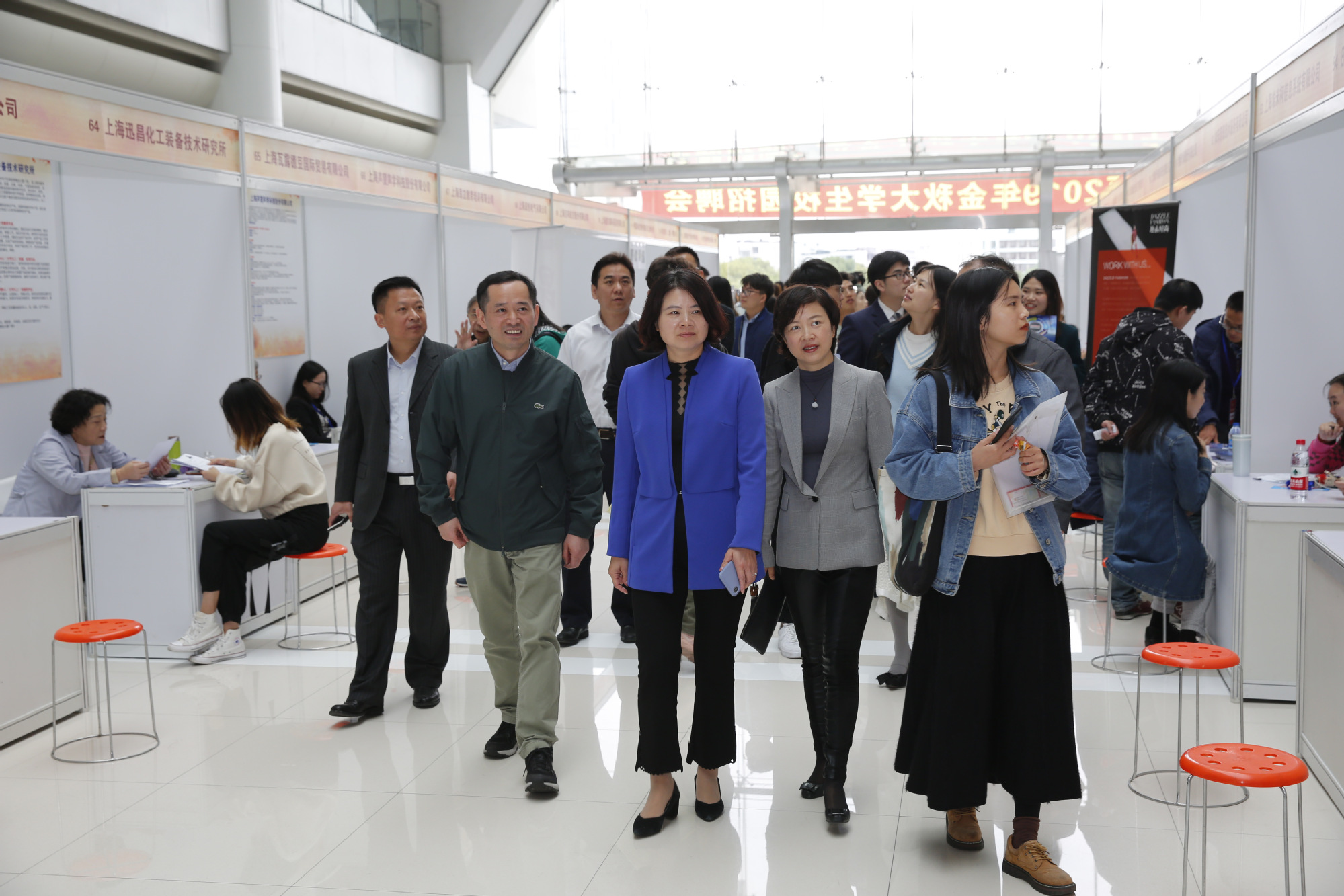 为推进我校2020届毕业生就业工作,帮助毕业生实现更充分、更高质量就业,11月12日,由我校和长宁区人力资源和社会保障局联合主办的“青春启航·逐梦长宁”2019年长宁区金秋大学生校园招聘会在松江校区第一图文信息中心顺利举行。校党委副书记、副校长朱晓青在校长办公室主任曾国辉和学生工作部(处)长、研究生工作部部长朱蓓陪同下,热情接待了来校参会的长宁区人力资源和社会保障局党委副书记、副局长向可扬,长宁区就业促进中心书记、主任郭正跃,长宁区人才服务中心主任李源等一行并进行亲切会谈,随后共同视察了招聘会现场。