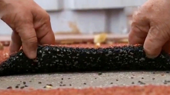 使用切割机将废旧轮胎切成颗粒,作为塑胶跑道材料之一。颗粒需要粘结,一些生产厂家就使用劣质胶水充当胶黏剂,而这种胶水含有大量甲醛、甲苯、二甲苯等有毒有害物质。