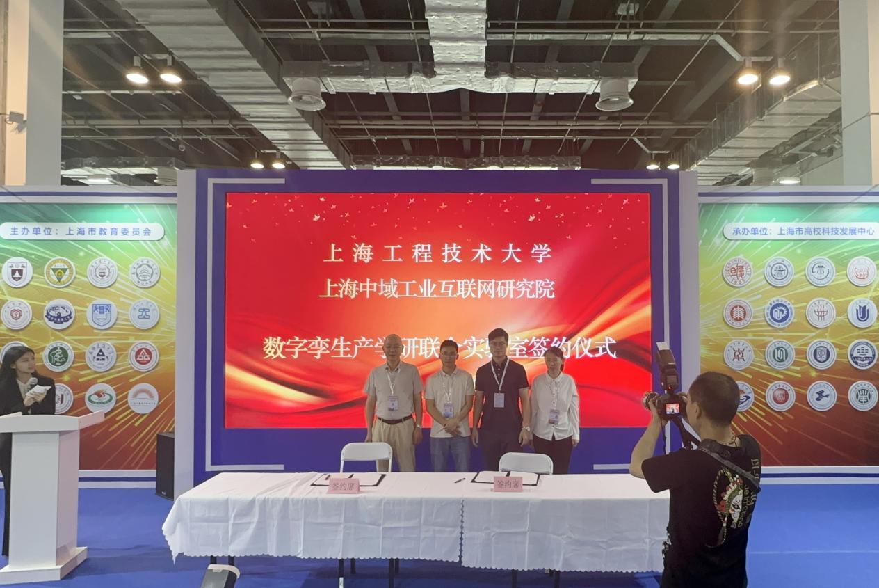 我校依托高校展区展出了《高品质生物医用聚氨酯及其高效抗凝小口径人工血管产品》《新型吸附与分离功能材料》《智慧停车系统》等12件科技成果,并与上海中域工业互联网研究院完成数字孪生产学研联合实验室的签约。
