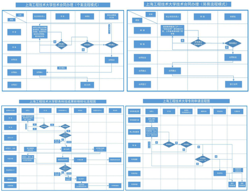 提升服务、精简流程,我处目前已完善修订“科研项目立项及预算调整流程图”,“技术合同办理-个案程图”,“技术合同办理-简易流程”,“职务科技成果转化流程图”,“专利申请流程图”五项业务流程图。
