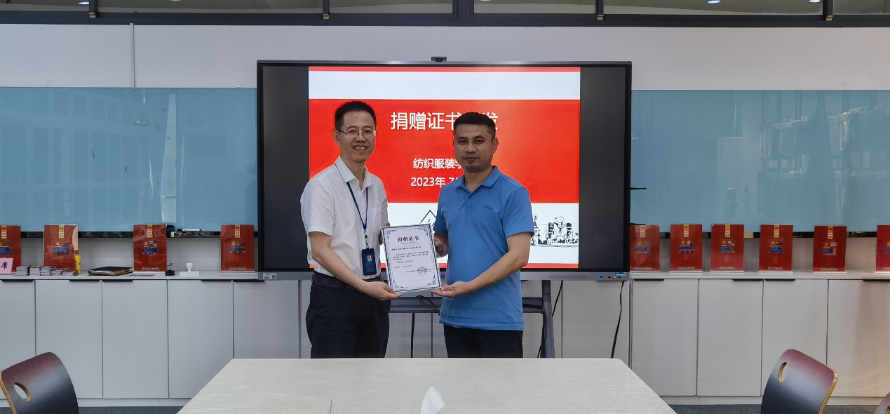 辛斌杰为深圳博克时代科技开发有限公司颁发捐赠证书,感谢其对纺织服装学院的慷慨捐赠和教育支持。