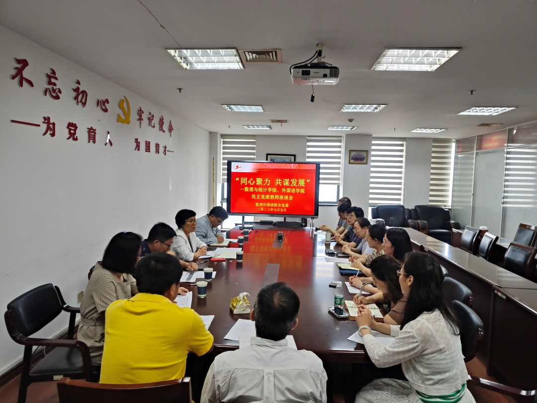 7月5日,数理外国语联合党委召开“同心聚力共谋发展”统战工作座谈会。数理外国语联合党委书记钱慧敏、数理与统计学院院长王国强、副院长吴建宝、民主党派教师代表、海外留学归国教师代表一起座谈、学习、交流,共商学院。